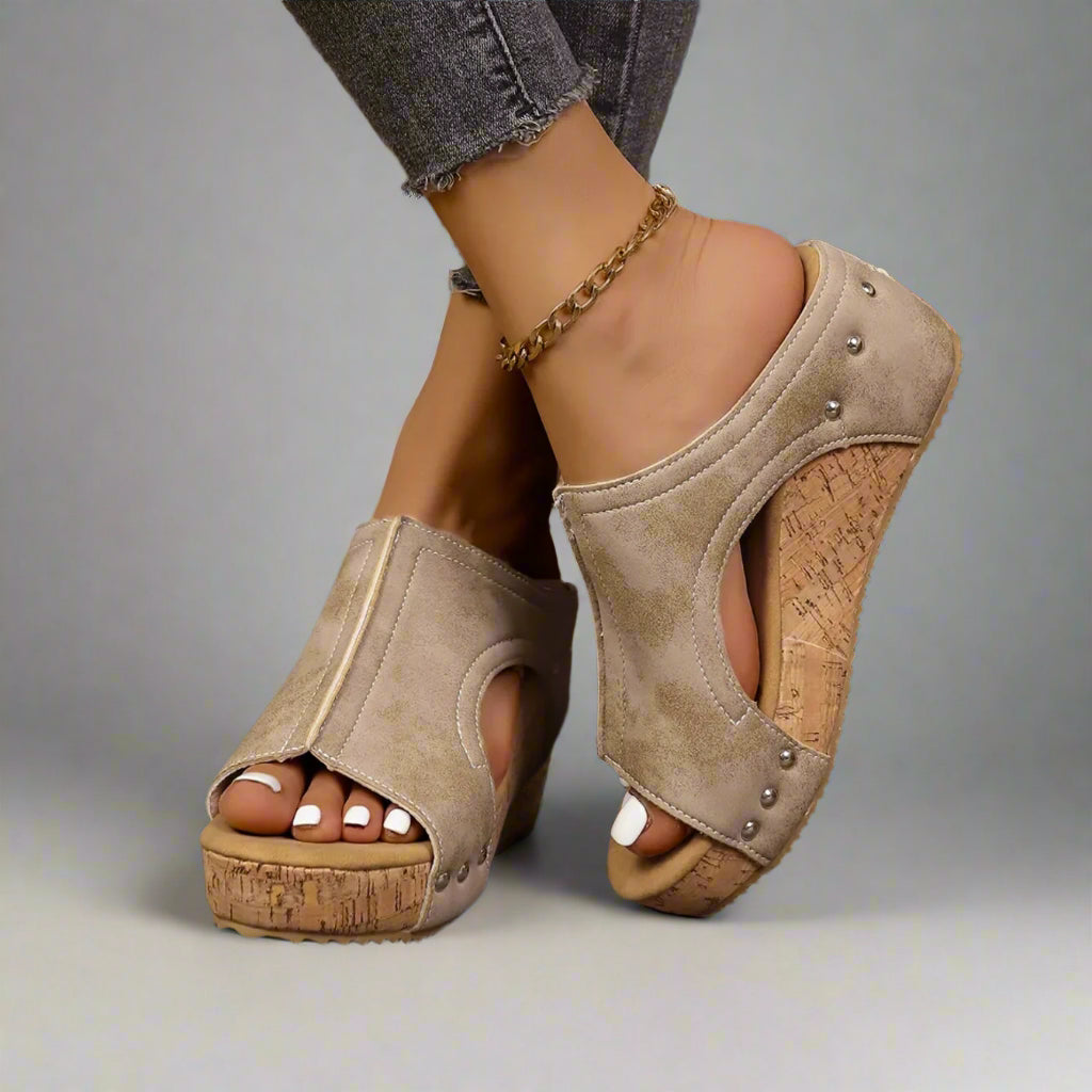 Designed with a soft leather upper and set atop a cork-inspired wedge, these sandals are a breezy blend of style and comfort.  Open-sided slip on keeps your feet cool while the cushioned Cloud9 insole supports all day.  Finished in modern sun-washed colorways.